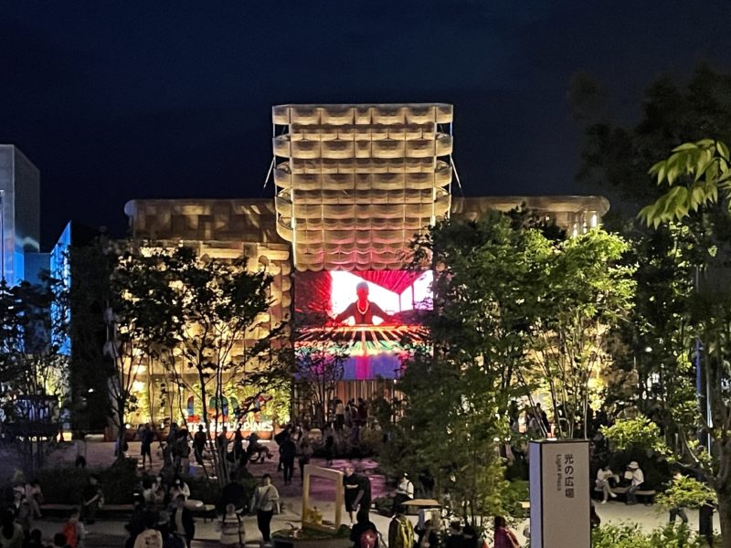 東ゲート、大屋根リングを抜けると、籐製の躍動感あるパビリオンと共にこちらのスクリーンが目に入り、わくわく感が高まりました。
