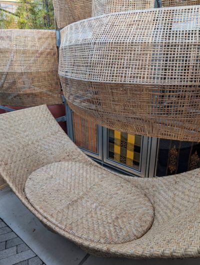 ファサード(建物の外観)を覆う手編みの籐は美しく、風が吹き抜けるようで涼やかで南国ならではの自然素材です。アートな籐ベンチは座り心地が良くて快適です。